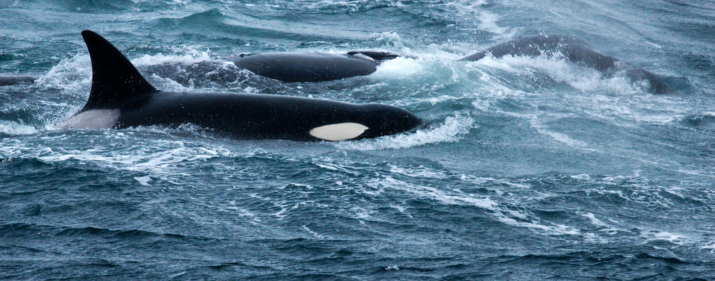 A pod of transient Orcas in the process of killing a Gray Whale calf.